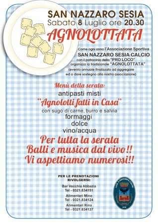 La tradizionale "Agnolottata" con agnolotti fatti in casa, si svolgerà sabato 8 luglio alle 20.30 in Piazza Vittorio Veneto a San Nazzaro Sesia.