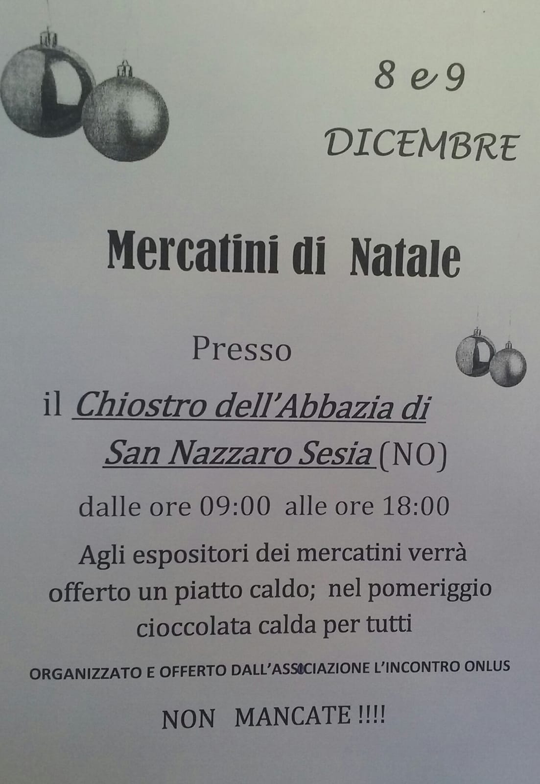 Sabato 8 e domenica 9 dicembre, presso il Chiostro dell'Abbazia di San Nazzaro Sesia (NO), dalle ore 9,00 alle ore 18,00, l'Associazione L'Incontro onlus, organizza mercatini di Natale. Agli espositori dei mercatini verrà offerto un piatto caldo; nel pomeriggio cioccolata per tutti... Non Mancate!!!