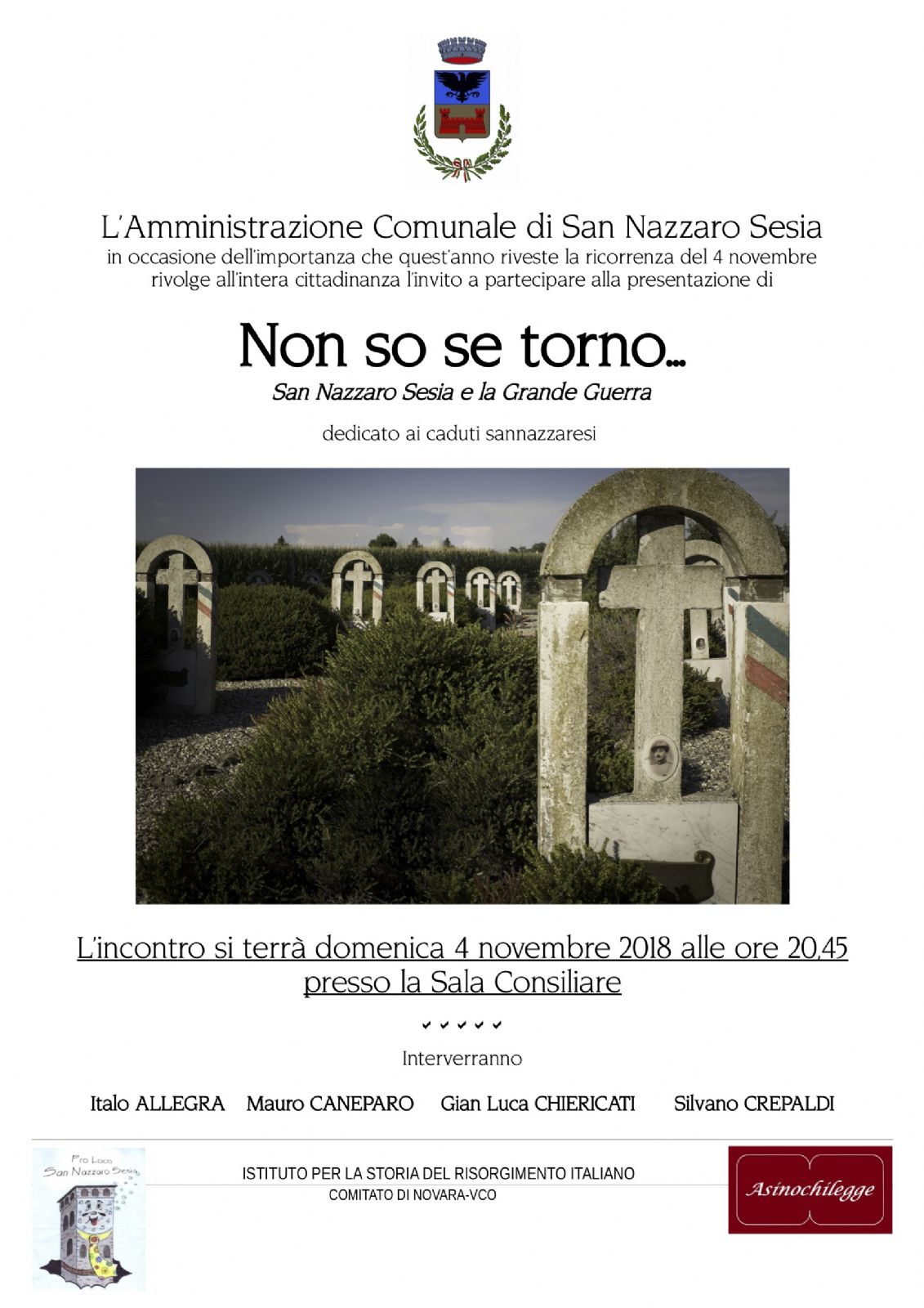 Domenica 4 novembre, ore 20,45 presso la Sala Consiliare del Comune di San Nazzaro Sesia, interverranno: Italo ALLEGRA, Mauro CANEPARO, Gian Luca CHIERICATI, Silvano CREPALDI
