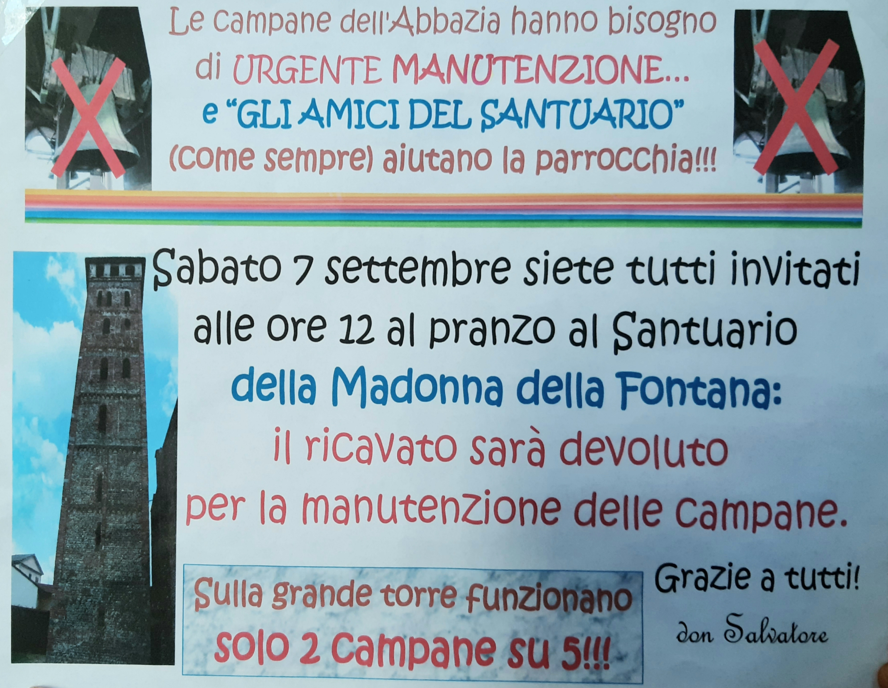Siete tutti invitati sabato 7 settembre ore 12,00 al grande pranzo presso il Santuario della Madonna della Fontana, il cui ricavato verrà devoluto per la manutenzione delle campane della nostra torre campanaria.