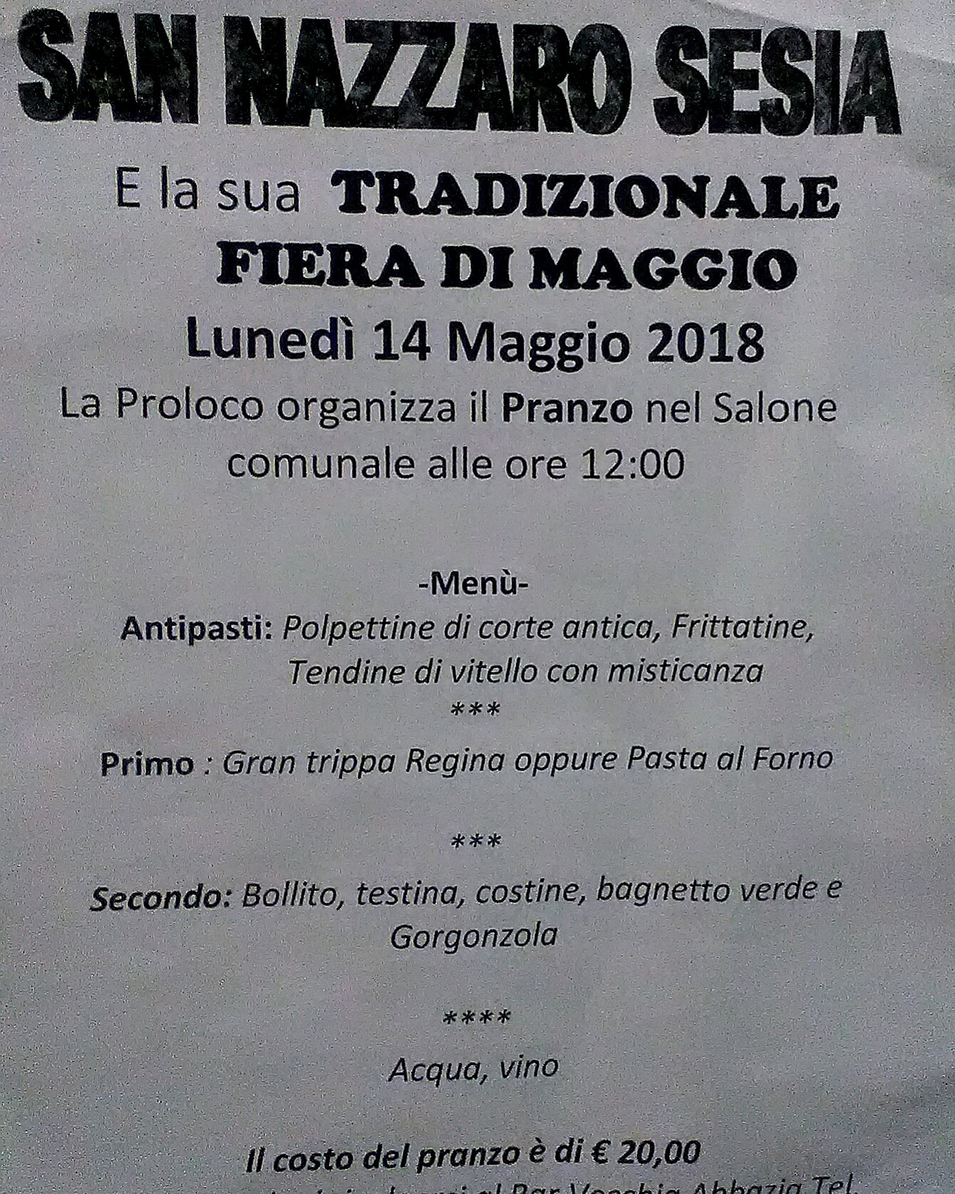 Ore 11,45 - Salone Comunale - Pranzo tipico a base di trippa (possibilità di menù alternativo o da asporto) a cura della Pro Loco (prenotazioni bar Vecchia Abbazia 0321 834151 o Alessio 3475012508