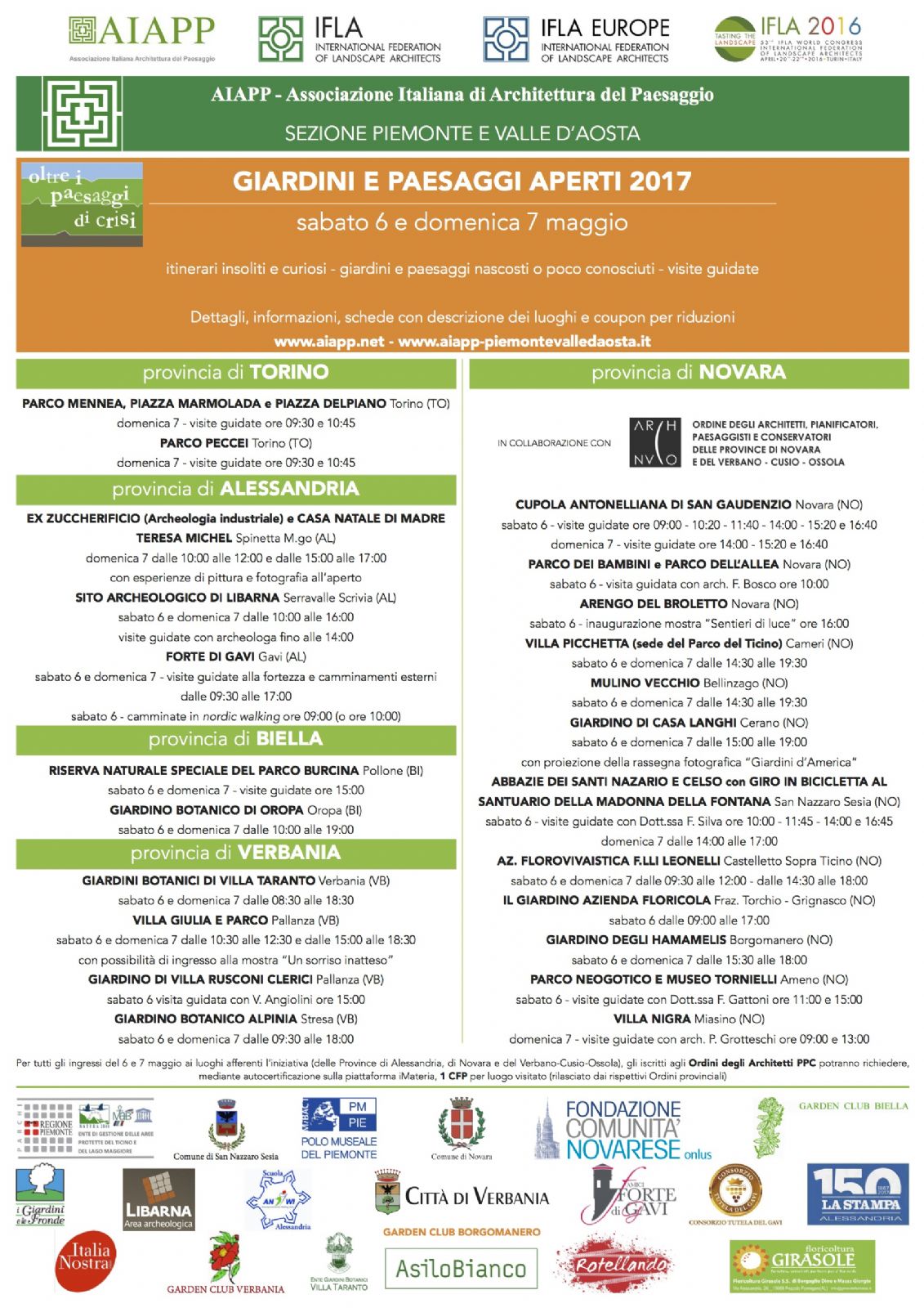 “Giardini e Paesaggi Aperti 2017″ a cura di AIAPP sezione Piemonte e Valle D' Aosta - si svolgerà sabato 6 e domenica 7 maggio, con itinerari insoliti e curiosi, giardini e paesaggi nascosti o poco conosciuti, visite guidate, nelle Province di Torino, Alessandria, Biella, Verbania e Novara. Per i dettagli fare riferimento alla locandina dell’evento.