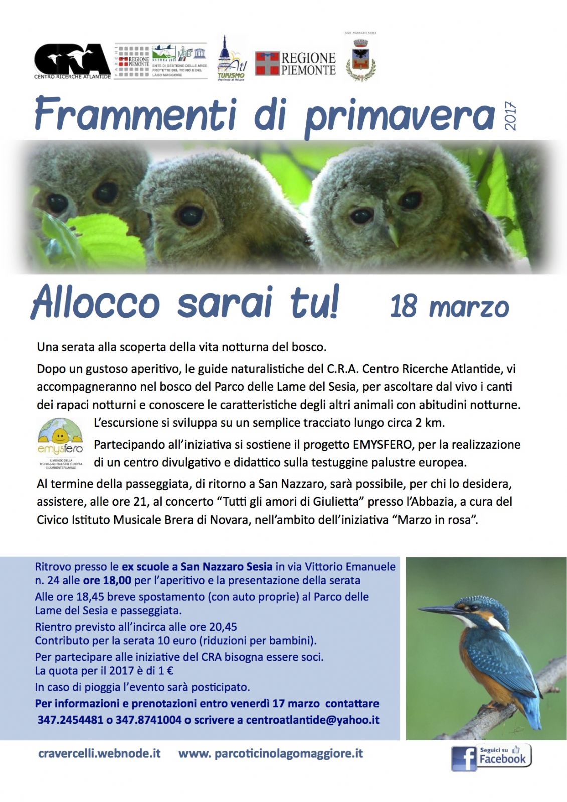 Il ritrovo è a San Nazzaro Sesia (NO) presso le ex scuole in via Vittorio Emanuele n. 24 alle ore 18,00 per l’aperitivo e la presentazione della serata.. Il Contributo per la serata è di 10 euro (gratis i ragazzi fino a 10 anni). Partecipando all’iniziativa si sostiene il progetto EMYSFERO, per la realizzazione di un centro divulgativo e didattico sulla testuggine palustre europea.