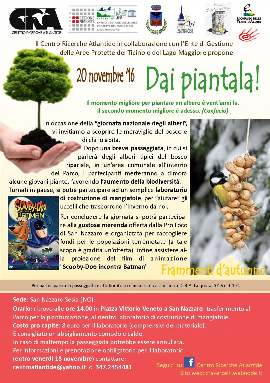 In occasione della “Festa dell’albero” domenica 20 novembre il CRA – Centro Ricerche Atlantide, in collaborazione con il Comune di San Nazzaro Sesia, organizza “Dai….Piantala” una giornata per osservare, parlare, conoscere gli alberi e…piantarne un albero.