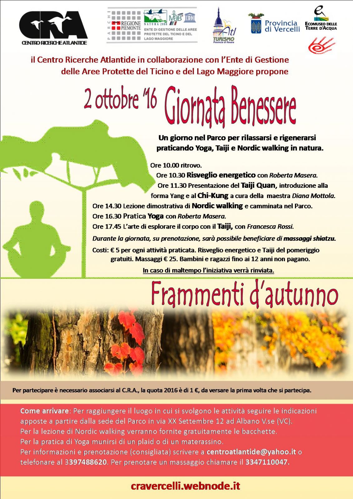 Le iniziative di “Frammenti di autunno” prendono il via domenica 2 ottobre al Parco delle Lame del Sesia con la “Giornata benessere”, un’occasione per rilassarsi, rigenerarsi e prendersi cura di sé. Si sa infatti che lo sport fa bene e fa ancora meglio se viene praticato in un ambiente naturale, lontano da rumori molesti e dallo smog cittadino, in un piacevole contesto conviviale. Il ritrovo è per le ore 10 al Parco (seguire le indicazioni apposte a partire dalla sede del Parco situata ad Albano V.se (VC) in via XX Settembre 12), per iniziare alle 10.30 con il “risveglio energetico”, una breve sessione di esercizi yoga per riattivare mente e corpo. Dalle 11.30 alle 12.30 esperti e neofiti potranno cimentarsi con il Taiji e il Chi Kung, guidati dalla maestra Diana Mottola. Dopo la pausa pranzo, alle ore 14,30, la guida del Parco Anna Pepe, in seguito a una breve lezione introduttiva al Nordic walking, accompagnerà i presenti lungo una rilassante passeggiata nel Parco. Le bacchette da nordic walking saranno fornite gratuitamente a chi ne fosse sprovvisto. Alle 16.30 sarà la volta delle asana di Hata Yoga proposte da Roberta Masera (portare un materassino o un plaid). Francesca Rossi concluderà la giornata con una breve lezione dimostrativa di Taiji, inteso anche come arte di esplorare il corpo.