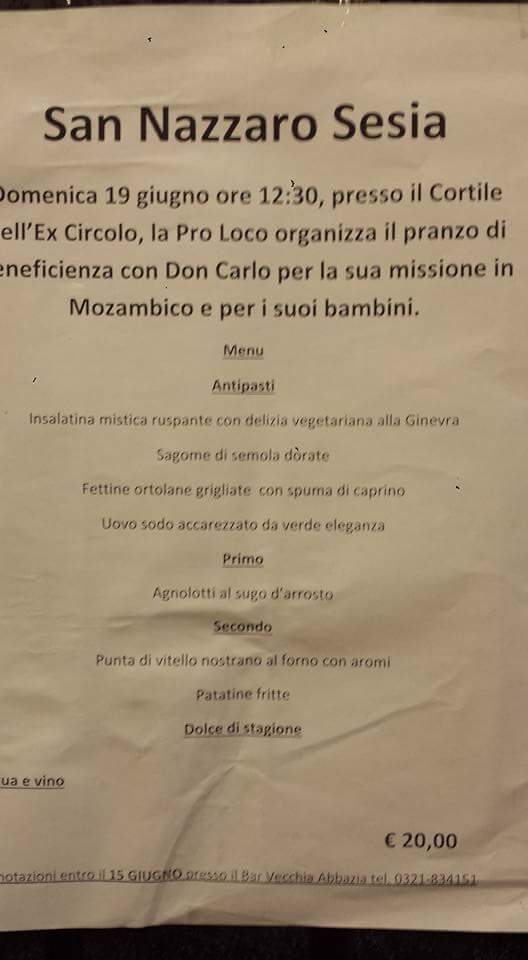 Domenica 19 giugno alle 12,30 presso il cortile dell'ex Circolo, la Pro Loco organizza un pranzo di beneficenza con don Carlo per raccogliere fondi per la Missione in Mozambico. Come sempre il menù è ricchissimo e per palati sopraffini e include antipasto, primo e secondo, dolce, acqua e caffè a soli Euro 20. Intrattenimento musicale del Crystal Special Duo… buon cibo, buona musica e beneficenza… vi aspettiamo numerosi….