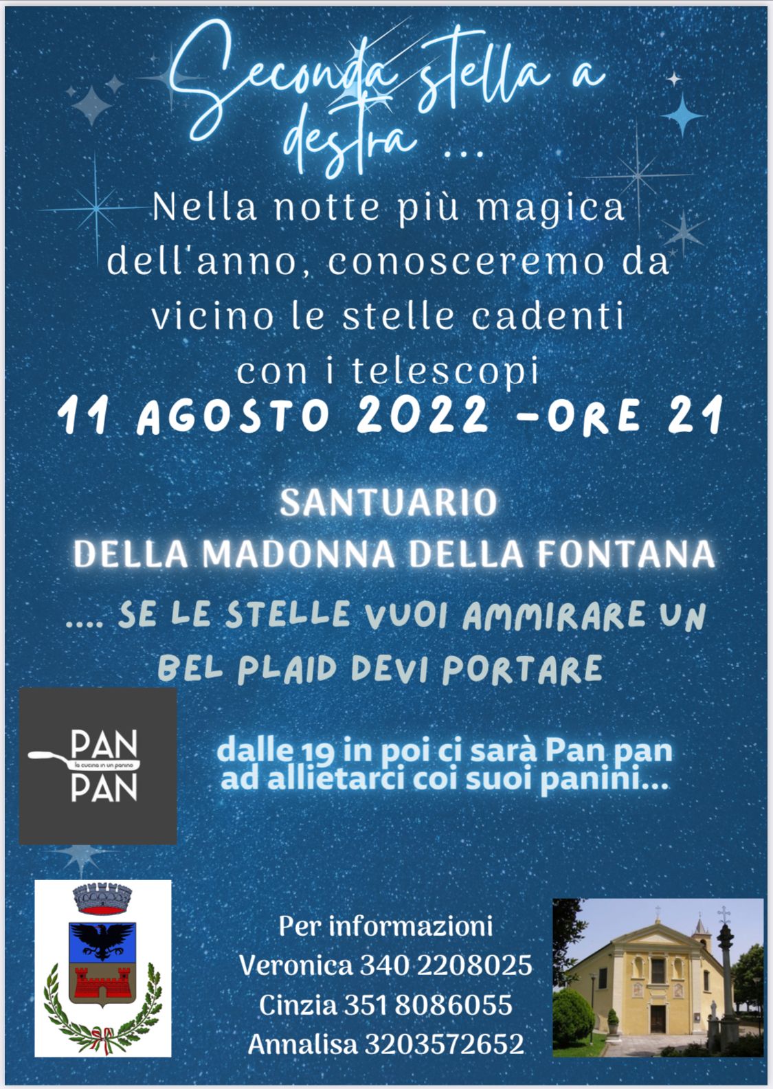 L'amministrazione organizza per chi non è andato in vacanza una serata di osservazione delle stelle con astronomi professionisti, giovedì 11 agosto al Santuario Della Madonna della Fontana. Dalle ore 20 ci sarà la possibilità di degustare degli ottimi panini, osservare il cielo e le stelle senza inquinamento luminoso.
